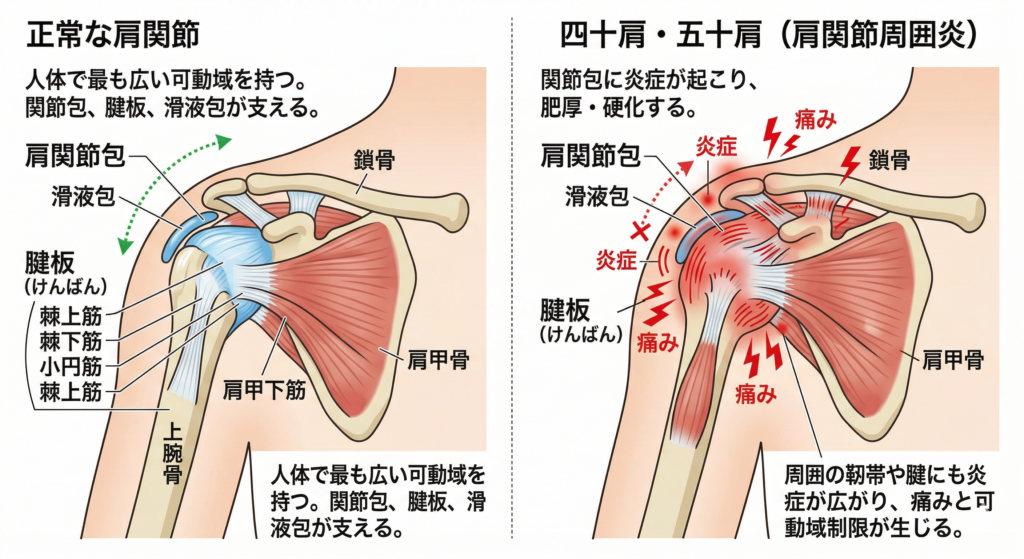四十肩・五十肩の正式名称は肩関節周囲炎(かたかんせつしゅういえん)です。肩関節を包んでいる関節包(かんせつほう)という袋状の組織に炎症が起こり、周囲の靱帯や腱にも炎症が広がることで、痛みと可動域の制限が生じます。