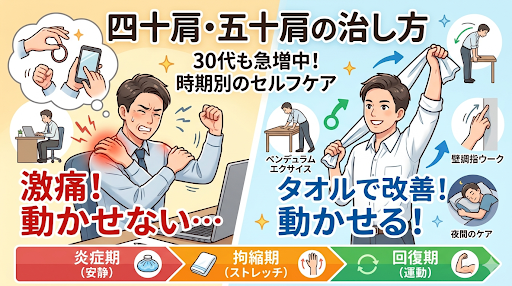 四十肩・五十肩は「炎症期→拘縮期→回復期」と段階的に進行し、それぞれの時期に合ったケアをすることで回復を早めることができます。炎症期は安静と振り子運動、拘縮期からはタオルストレッチや壁の指歩きストレッチで少しずつ可動域を取り戻しましょう。夜間痛には寝姿勢の工夫も有効です。痛みが長引く場合や可動域がまったく戻らない場合は、自己判断せず医療機関に相談してください。
