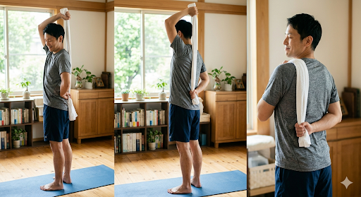 フェイスタオルの両端を持ち、痛くない側の手を頭の上に、痛い側の手を腰の後ろに回します(背中でタオルを縦に持つ形)。痛くない側の手でタオルを上に引き、痛い側の腕をゆっくり引き上げます。「痛気持ちいい」と感じるところで15〜20秒キープし、ゆっくり戻します。これを5回繰り返します。