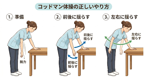 テーブルや椅子の背に痛くない側の手をつき、体を前に傾けます。痛い側の腕をだらんと垂らし、体の重心を前後・左右にゆっくり移動させます。腕の力は完全に抜き、体の揺れで腕が自然に振り子のように動くのに任せます。前後10回・左右10回・円を描くように10回を1セットとし、1日2〜3セット行います。