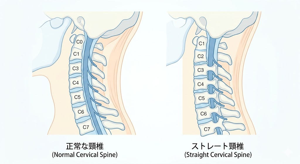ストレートネックとは、このC字カーブが失われて頸椎が一直線(ストレート)になってしまった状態のことです。湾曲がなくなると頭の重さをうまく分散できなくなり、首や肩の筋肉に過剰な負担がかかります。