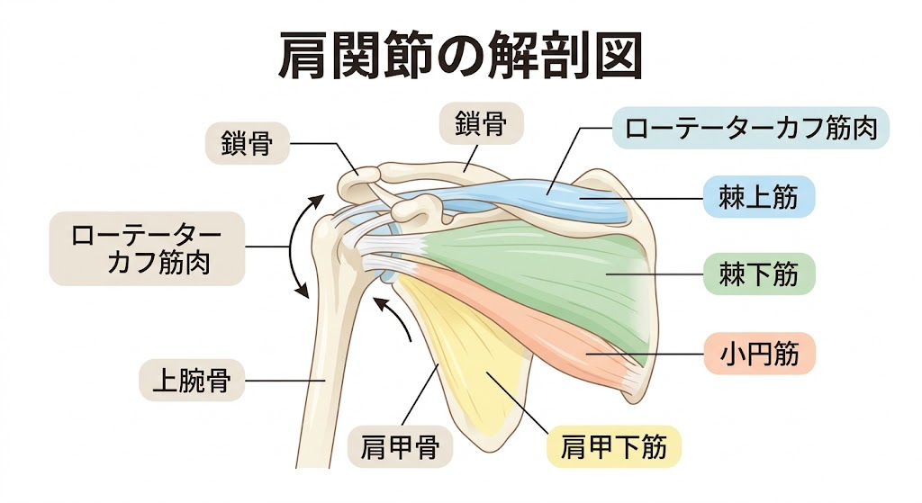 肩関節を支える筋肉の中でも特に重要なのがローテーターカフ(回旋筋腱板)と呼ばれる4つの筋肉群(棘上筋・棘下筋・肩甲下筋・小円筋)です。これらが弱くなったり硬くなったりすると、肩関節の動きが制限され、重だるさや痛みにつながります。