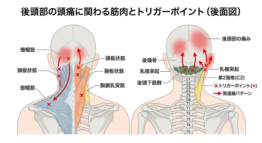 後頭部がズキズキ痛む、頭が重い、首のつけ根から頭にかけて締め付けられる感じがする——こうした症状は「緊張型頭痛(きんちょうがたずつう)」の典型的な特徴です。日本人の頭痛の中で最も多いタイプで、肩こり・首こりと深く関係しています。 後頭部の痛... -