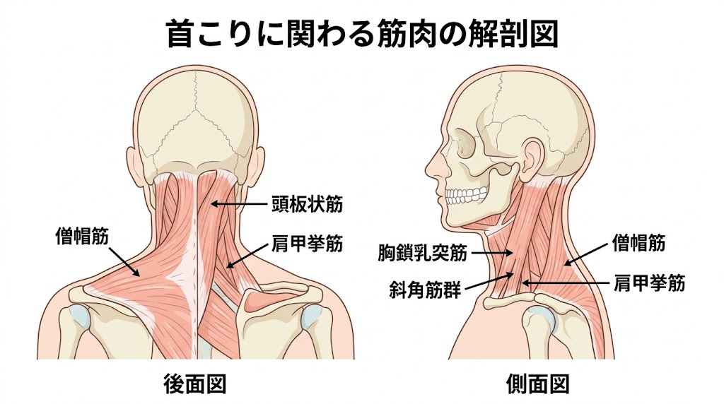 首こりと肩こりは似ているようで、原因も対処法も異なります。首は脳と体をつなぐ重要な部位であり、血管・神経・リンパ管が密集しています。正しい知識をもとにセルフケアを続けることで、慢性的な首こりを改善することができます。 首の筋肉を知ろう 首...