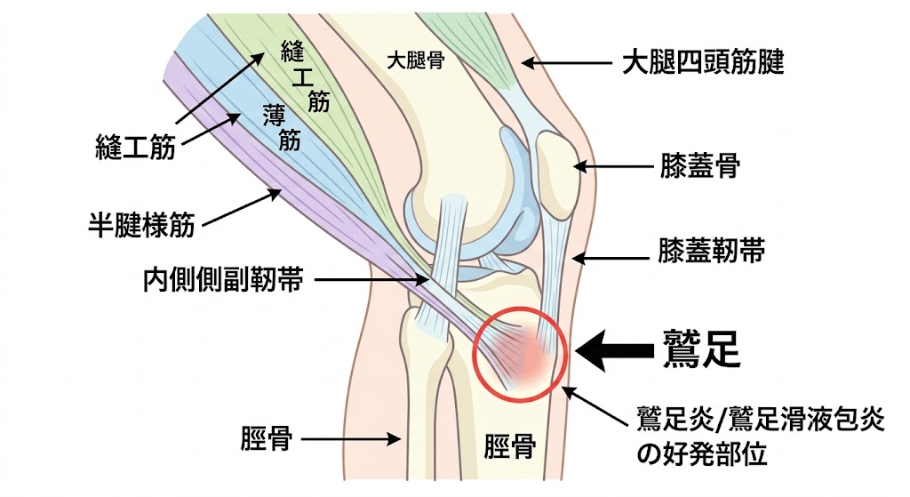 「膝を伸ばすと内側が痛む」「正座から立ち上がるときに膝の内側がズキッとする」——こうした症状は「鷲足炎(わそくえん)」と呼ばれる状態によく見られます。名前は聞き慣れないかもしれませんが、膝の痛みの中でも比較的多い原因の一つです。 鷲足とはど... -